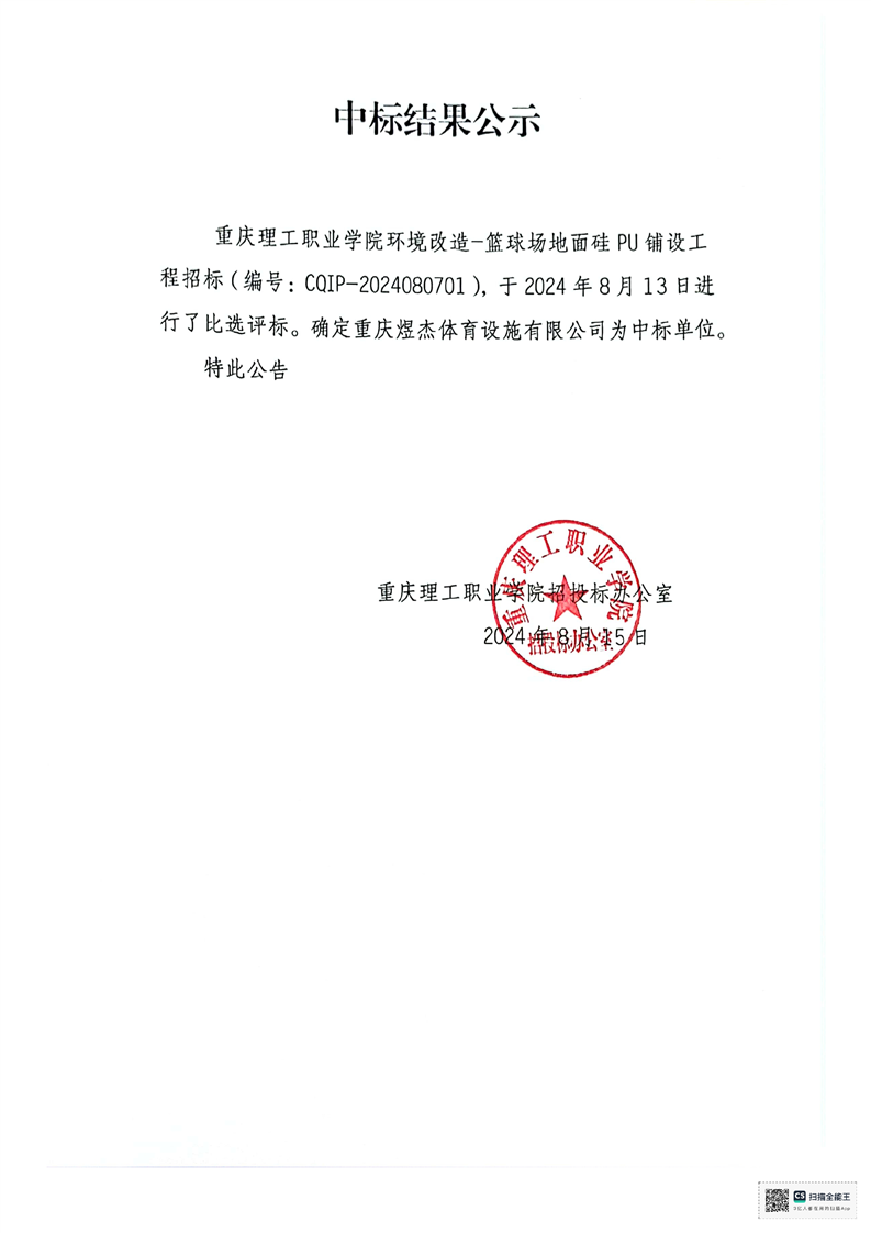 篮球场地面硅PU铺设中标结果公示
