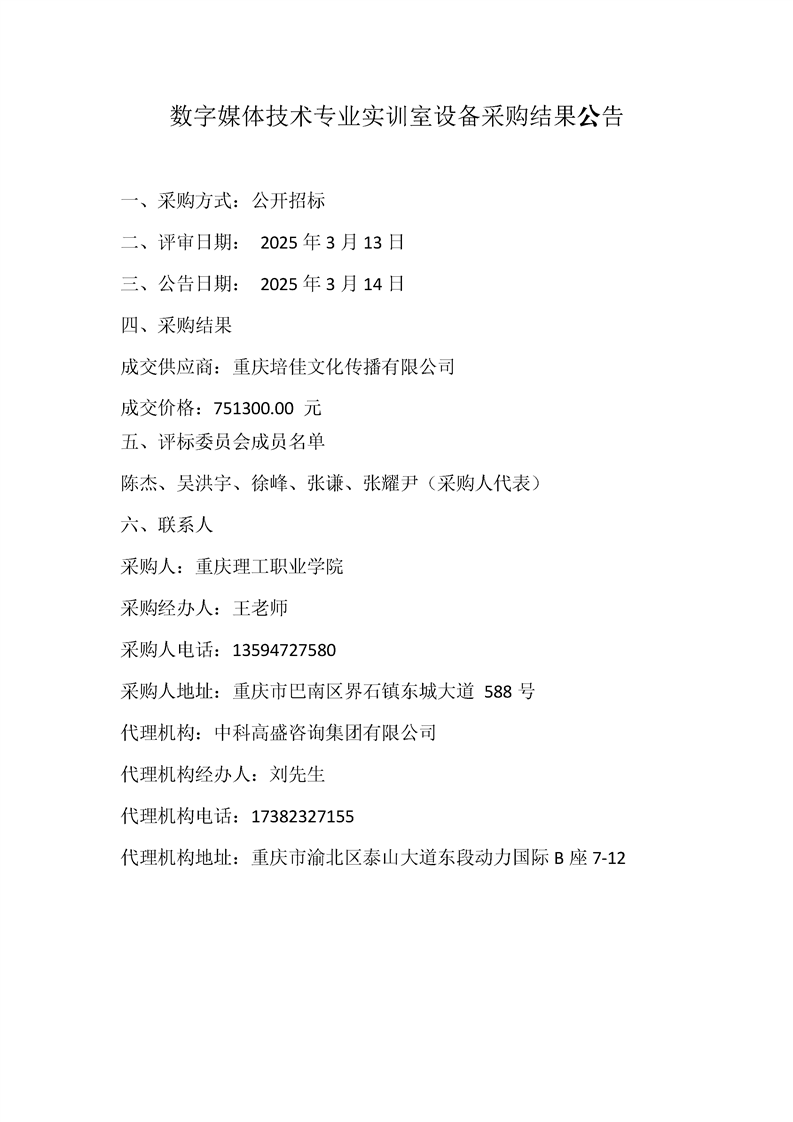数字媒体技术专业实训室设备采购结果公告