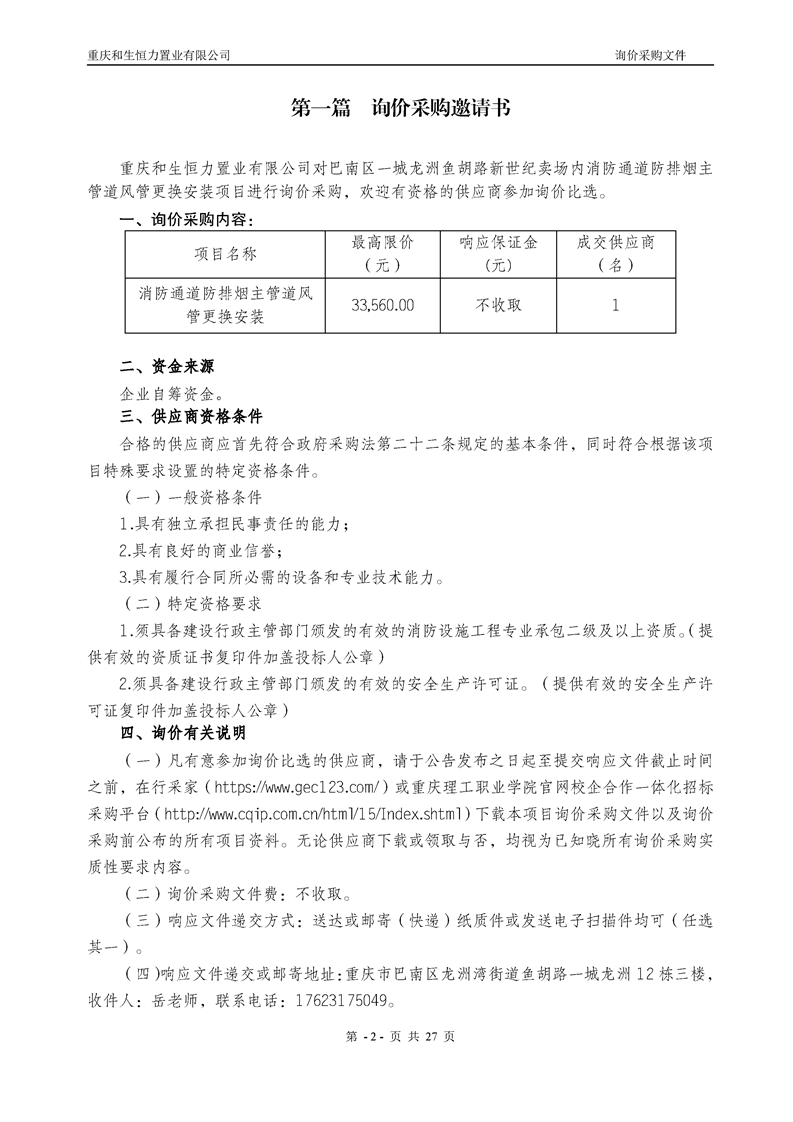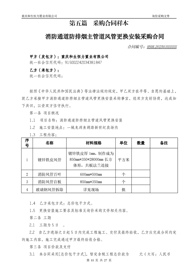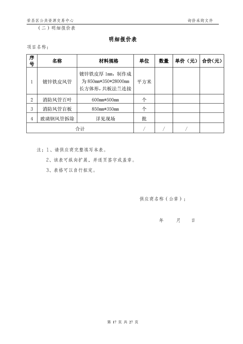 消防通道防排烟主管道风管更换安装询价采购公告