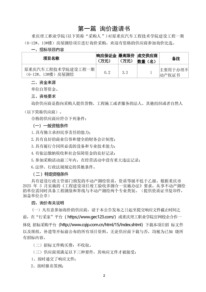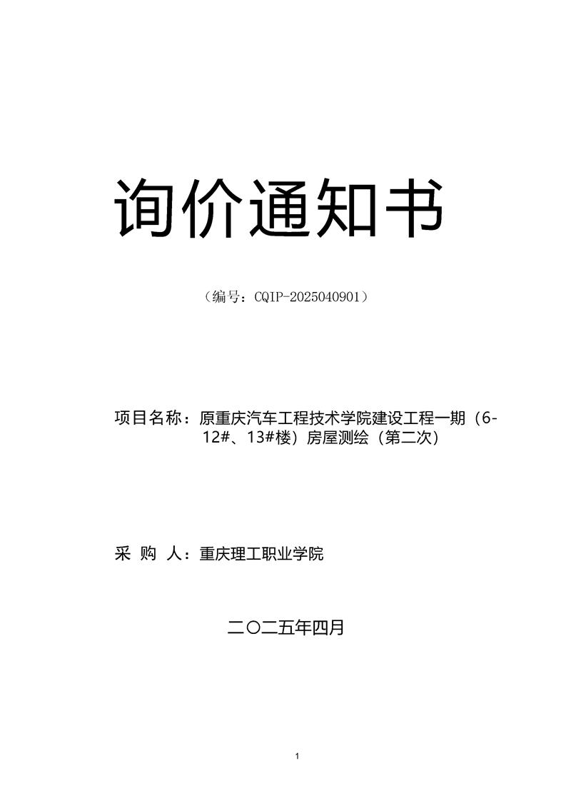 原重庆汽车工程技术学院建设工程一期(6-12#、13#楼)房屋测绘(第二次)询价文件