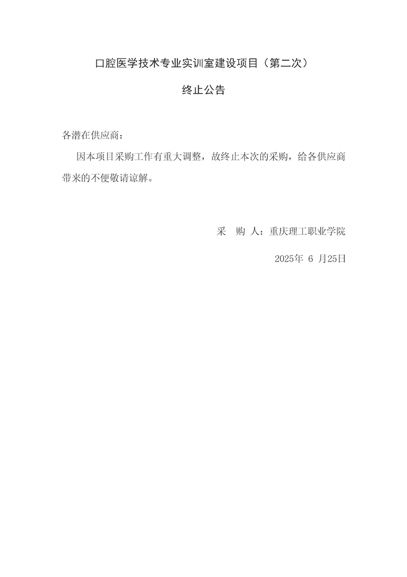 口腔医学技术专业实训室建设项目(第二次)终止公告