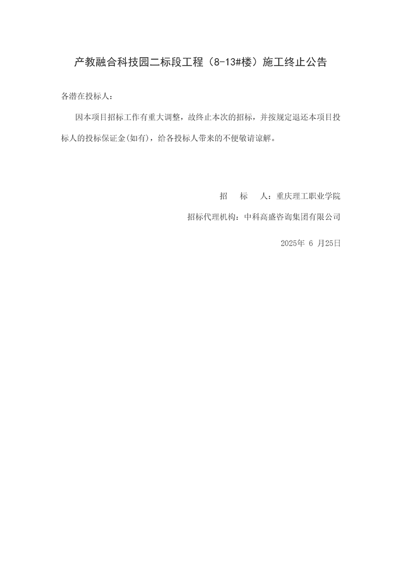 产教融合科技园二标段工程(8-13#楼)施工终止公告