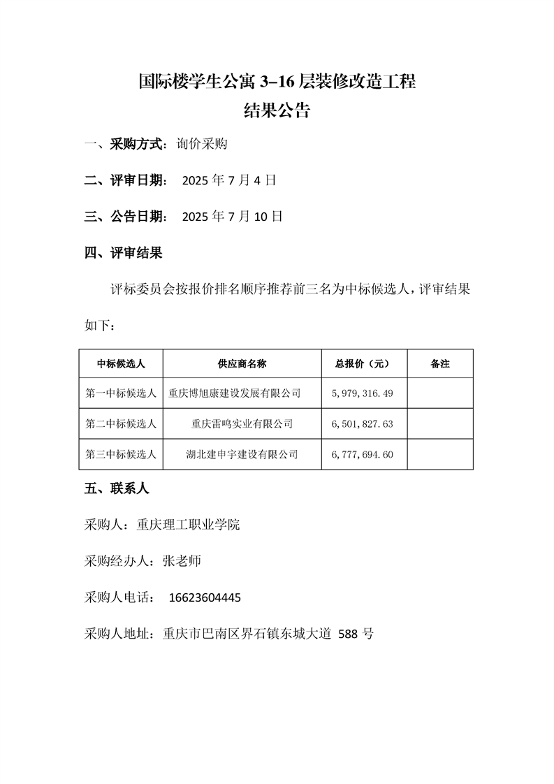 国际楼学生公寓3-16层装修改造工程结果公告