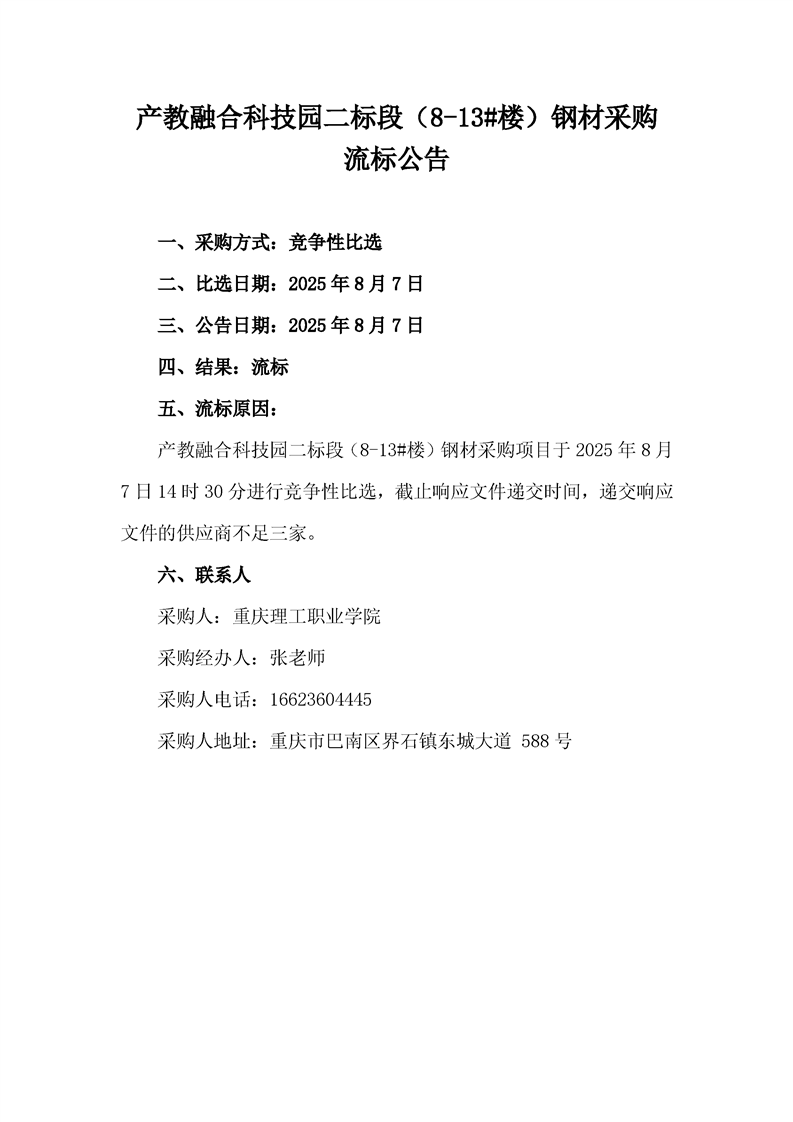 产教融合科技园二标段(8-13#楼)钢材采购流标公告