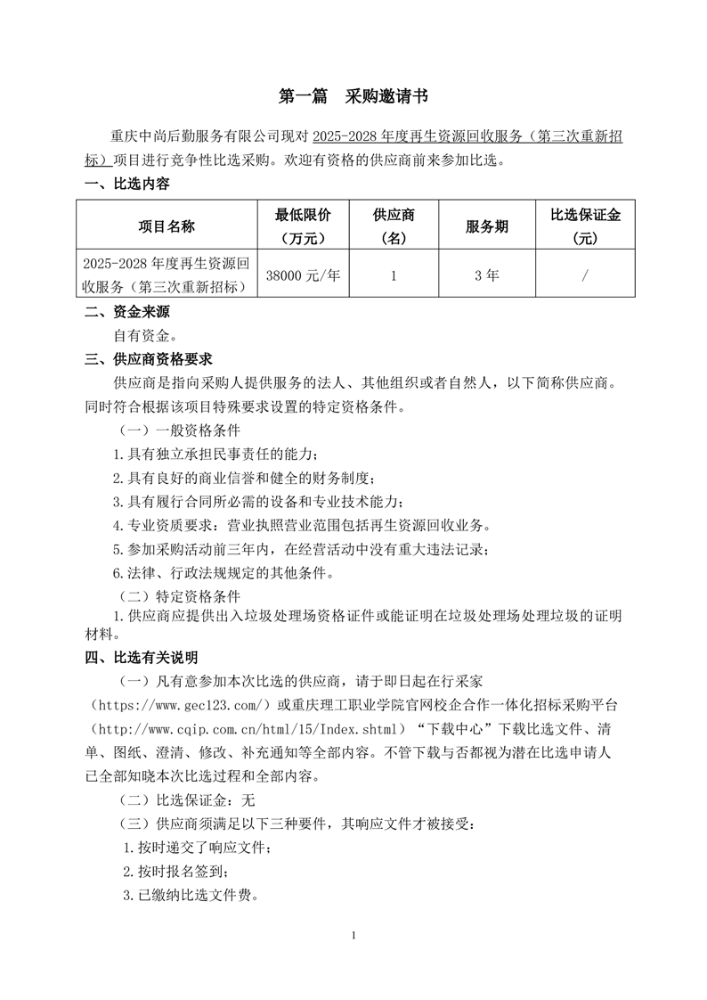 2025-2028年度再生资源回收服务(第三次重新招标)采购公告