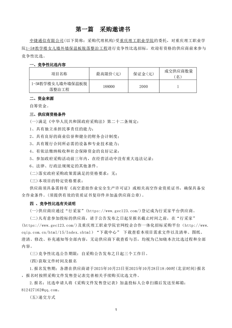 1-5#教学楼女儿墙外墙保温板脱落整治工程采购公告