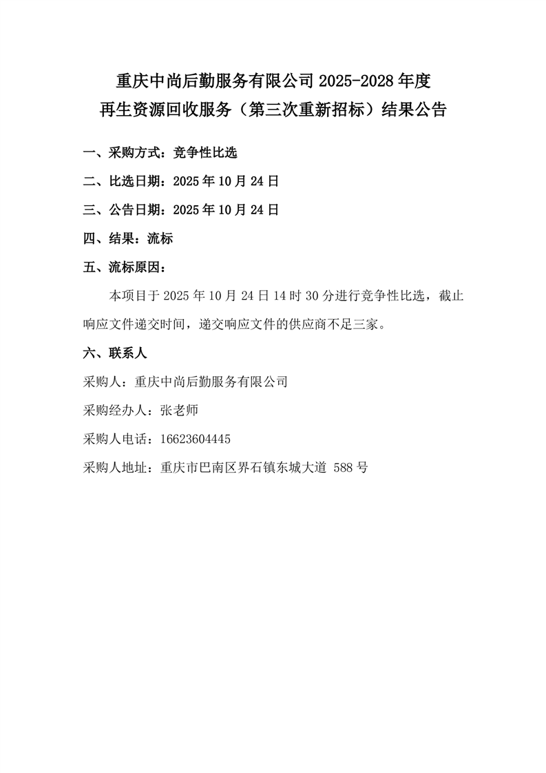 重庆中尚后勤服务有限公司2025-2028年度再生资源回收服务(第三次重新招标)结果公告
