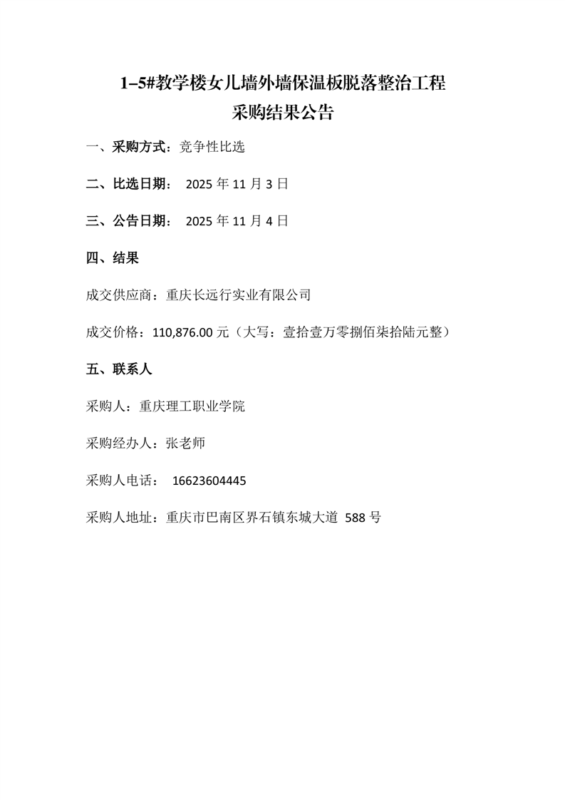 1-5#教学楼女儿墙外墙保温板脱落整治工程采购结果公告