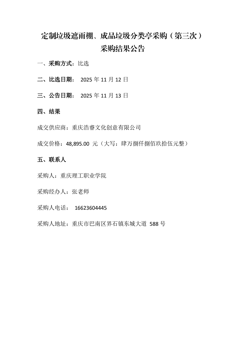 定制垃圾遮雨棚、成品垃圾分类亭采购(第三次)采购结果公告