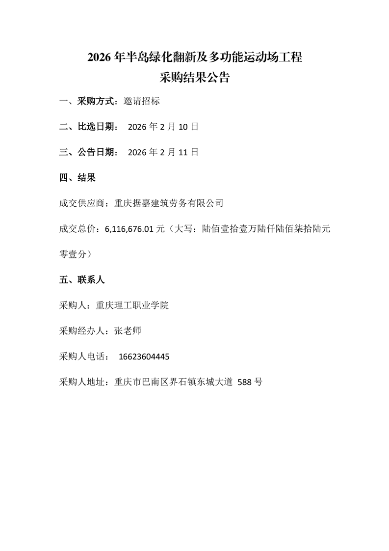 2026年半岛绿化翻新及多功能运动场工程采购结果公告