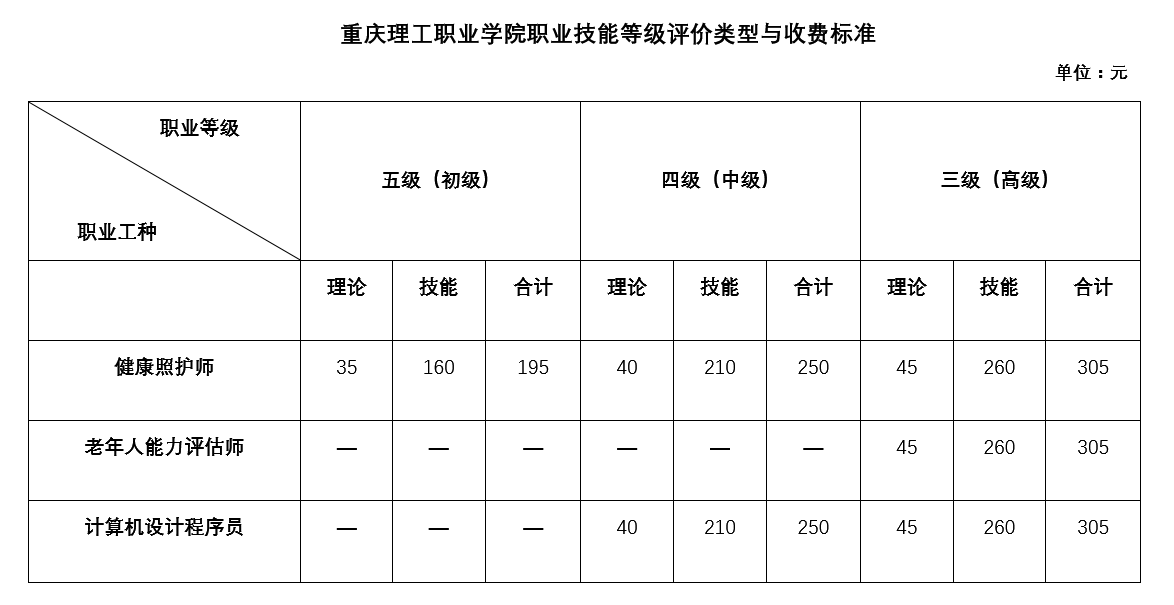 根据重庆市物价局 重庆市财政局《关于职业技能鉴定考试考务费收费标准及有关问题的通知》,经人力资源和社会保障局备案,现将职业技能等级评价类型与收费标准公示如下。