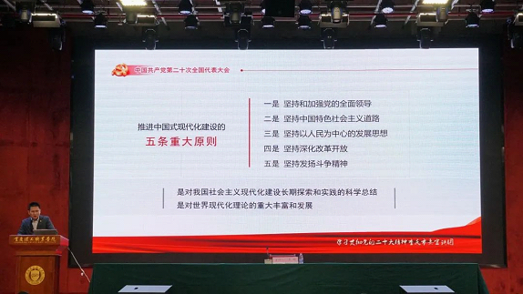 贾曦书记分别从党的二十大的主要成果和主要精神、党的二十大报告有关教育工作的重要论述和如何贯彻党的二十大精神促进beat365官网高质量发展等三个方面深入浅出的展开讲解。