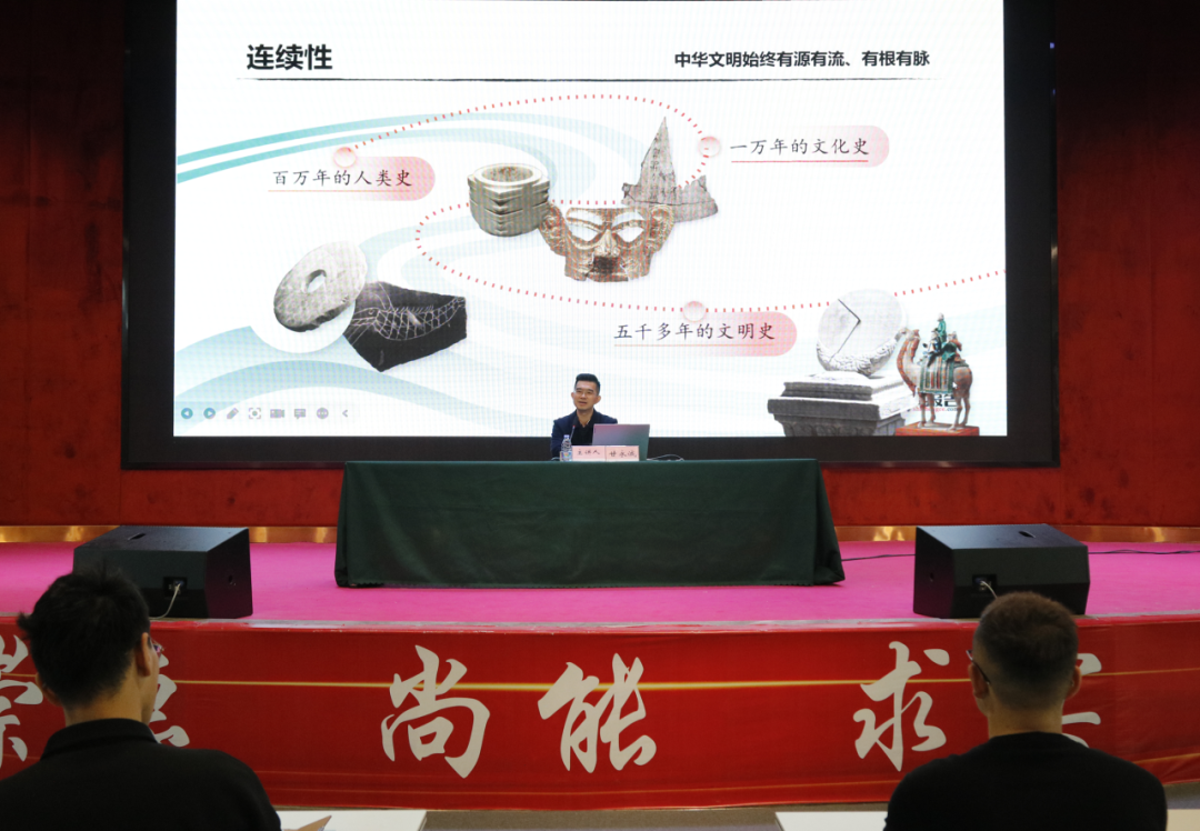 甘永诚副校长以夏、商、周等封建王朝的更替为切入点,从历史悠久缔造中华文化、培根铸魂推动文化繁荣、笃定前行建设现代文明等三个角度讲述了几千年来,中华民族能够历尽磨难而薪火不辍、屡经世变而固本开新的根本,这就在于中华文明源远流长、一脉相承,塑造了我们这个伟大的民族。通过分析中国古往今来的变革,从而更能深刻认识到,实现中华民族伟大复兴是近代以来中国人民的共同梦想。