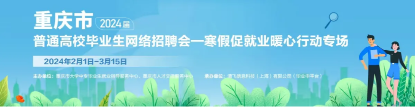为贯彻落实《教育部关于开展“寒假促就业暖心行动”的通知》(教就业司〔2024〕1号)要求,做好我市2024届普通高校毕业生寒假期间就业信息服务工作,多渠道整合就业资源,助力我市2024届普通高校毕业生高质量充分就业,重庆市大学中专毕业生就业指导服务中心、重庆市人才交流服务中心于2024年2月1日-3月15日,共同举办重庆市2024届普通高校毕业生网络招聘会—寒假促就业暖心行动专场,有关事项如下: