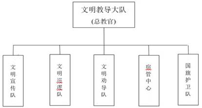 2021年10月26日学校素质教育中心、学生处制定了实施方案,召开了文明教育动员会,成立了文明教导大队,指定了总教官,下设文明宣传队、文明巡逻队、文明劝导队、宿管中心、国旗护卫队五支队伍,明确了职责与任务。