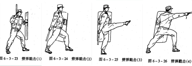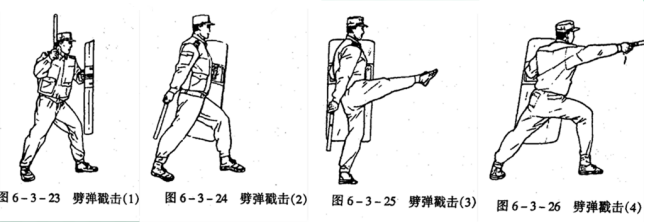 动作要领:①左脚进步的同时,左手持盾牌向前推挡,迅速收回盾牌,目视前方(图6-3-23);②右手持警棍由上向下劈击,盾牌置于身体左侧,目视前方(图6-3-24);③重心前移,右弹踢(图6-3-25),右脚向前落地成右弓步的同时,右手持警棍经腰际向前戳击,警棍前端略高于肩,上体微向前倾,左手持盾牌置于身体左侧,左大臂紧贴肋部,目视前方(图6-3-26)。