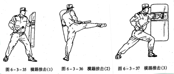 动作要领:①左脚进步的同时,左手持盾牌向前推挡,迅速收回盾牌,同时右手持警棍收于腰际,目视前方(图6-3-35);②身体左转,右横踢,左手持盾牌摆于身体左侧,右手持警棍置于身体右侧,目视前方(图6-3-36);③右脚向前落地成右弓步,上体右转的同时,左手持盾牌(正面向左)向前猛力推击(左臂与肩同高),右手持警棍收于腰际,上体微向前倾,目视前方(图6-3-37)。