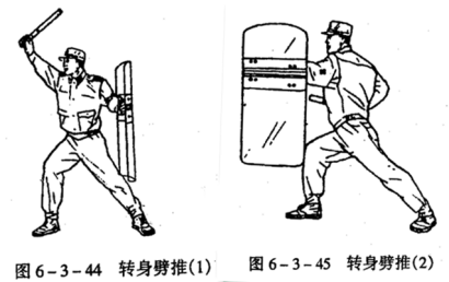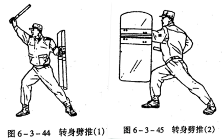 动作要领:身体右转180°成右弓步的同时(图6-3-44),右手持警棍向右斜下劈击,随即左手持盾牌(正面向左)向前推击,左手约与肩同高,左脚向左前滑步(约10cm)成右弓步,目视前方,盾牌垂直于地面(图6-3-45)。