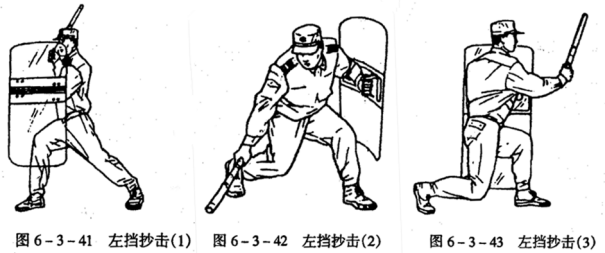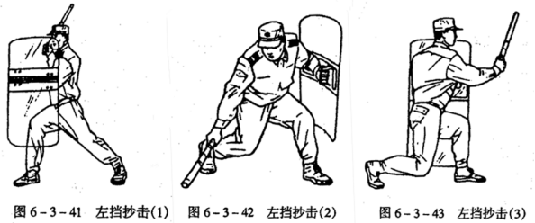 动作要领:①右脚上步成右弓步的同时,左手持盾牌向左格挡,右手持警棍上举置于头部右侧,目视前方(图6-3-41):②身体左转180°成骑龙步的同时,右手持警棍随身体转动经前下向后上擦地抄击(图6-3-42),右手略低与肩,手腕稍内扣,盾牌置于身体左侧,目视前方(图6-3-43)。
