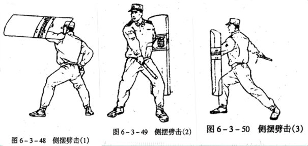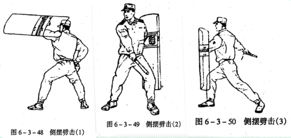 动作要领:①左脚上步成半马步的同时,左手持盾牌向右前斜上方摆击,左大臂约与肩同高,盾牌正面朝向左斜上方,右手持警棍置于身体右腰侧,目视前方(图6-3-48);②上体左转,右脚上步落地的同时,右手持警棍从腰际向前戳击,警棍前端略高于肩,上体微向前倾,盾牌置于身体左侧与地面垂直,目视前方(图6-3-49);③上体右转成右弓步的同时,右手持警棍向右下劈击,盾牌摆于身体左前方,警棍置于身体右侧,目视前方(图6-3-47)