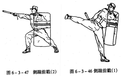 动作要领:①左脚向右脚后垫步,身体左转的同时,右侧踹,左手持盾牌摆于身体左侧,右手持警棍摆于身体右侧,目视前方(图6-3-46);②右脚向前落地成右弓步的同时,右手持警棍从腰际向前戳击,警棍前端略高于肩,上体微向前倾,盾牌置于身体左侧与地面垂直,目视前方(图6-3-47)。