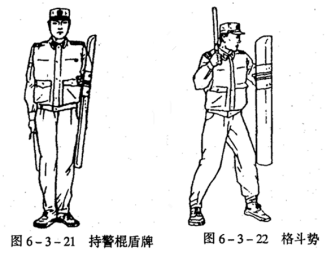 格斗式:在持警棍盾牌的基础上(图6-3-21),听到“警棍盾牌操——预备”的口令后,身体半面向左转的同时,右脚向右后撤一步,两脚距离略比肩宽,左手持盾牌护于左胸前,距身体约20厘米,盾牌上沿稍高于下颌,右手持警棍屈臂上举后拉置于头部右侧,成格斗势(图6-3-22)。