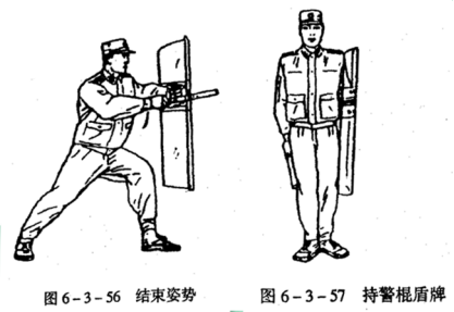 动作要领:①身体左转180°成左弓步的同时,左手持盾牌置于身体左前方,左大臂约与肩同高,右手持警棍平抡于盾牌右侧中部击响,两臂微弯,目视前方(图6-3-56);②上体右转的同时,左手持盾牌置于身体左侧,右手持警棍,同时收于腰际,左脚收于右脚后侧,脚跟离地,两腿挺直,左脚靠拢右脚的同时,恢复持警棍盾牌立正姿势(图6-3-57)。