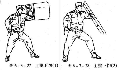 动作要领:①左脚迅速上步,右脚跟进成半马步的同时,左手持盾牌向前上挑击,左大臂抬起略低与肩,盾牌下沿稍高于上沿,右手持警棍收于腰侧,目视前方(图6-3-27);②左脚进步的同时,左手持盾牌向下切击,盾牌下沿与裆部同高,盾牌面与水平线约成45度角,目视前方(图6-3-28)。