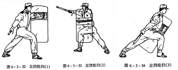 动作要领:①右脚上步成右弓步,左手持盾牌向左挡格(图6-3-32),身体向左转180°成左弓步的同时,右手持警棍由右向左平抡(警棍前端与左肩同高),盾牌置于身体左侧,目视前方(图6-3-33);②身体向右转180°成左弓步的同时,右手持警棍向右下扫击,上体微前倾,警棍置于身体右侧,与右臂略成一线,左手持盾牌随身体自然前倾,目视前方(图6-3-34)。