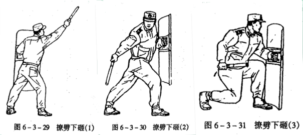 动作要领:①右脚上步,上体左转的同时,右手持警棍由下向左上撩击(两腿挺直,右脚跟离地稍外摆),左手持盾牌摆于身体左侧,目视前方(图6-3-29);②上体右转的同时,右手持警棍向右下劈击(两腿微屈左脚跟离地稍外摆),目视右下方,盾牌正面朝向正前方(图6-3-30);③左脚上步,右脚跟进成右跪步的同时,左手持盾牌向下砸击,盾牌下沿着地(距左脚约10cm),右手持警棍收于腰际,目视前方(图6-3-31)‘
