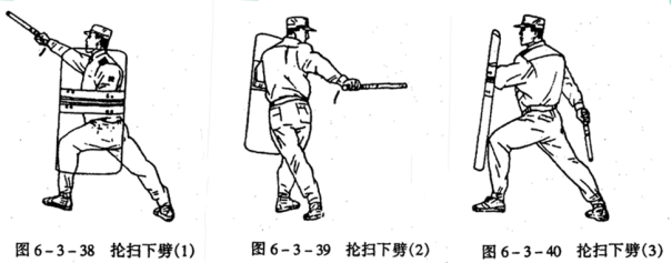 2.扫击一一单手持警棍由右向左或由左向右划弧线横击为平扫;向左或向右扫击膝关节以下部位为下扫。平扫主要用于扫对方肋、腰部。下扫主要用于扫对方小腿或踝部。