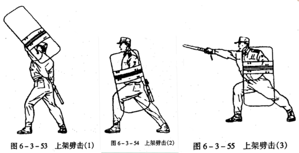 动作要领:①左脚上步成半马步的同时,左手持盾牌屈臂内旋,经身体左前上架外格于左上侧(左大臂略高于肩,盾牌置于左臂外侧),右手持警棍置于身体右侧,目视前方(图6-3-53),②将盾牌向左下猛力劈击,随即将警棍向前下迅速劈击,成左弓步,盾牌略向左前倾斜,警棍置于身体右后侧,目视前方(图6-3-54);③右脚上步成右弓步的同时,右手持警棍从腰侧向前戳击,身体微向前倾,警棍前端略高于肩,左手持盾牌置于身体左侧垂直于地面,日视前方(图6-3-55)。