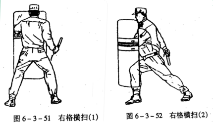 动作要领:①左脚上步成马步的同时,身体右转90°,左手持盾牌向右格挡,距身体约10cm,盾牌上沿稍高于下颌,面朝正前方,警棍置于腰侧,目视前方(图6-3-51);②右脚向左后插步,身体右转270°成右弓步的同时,右手持警棍横扫于身体右后侧(警棍略平,与腰同高),盾牌置于身体左前(上沿与下颌同高),目视前方(图6-3-52)。