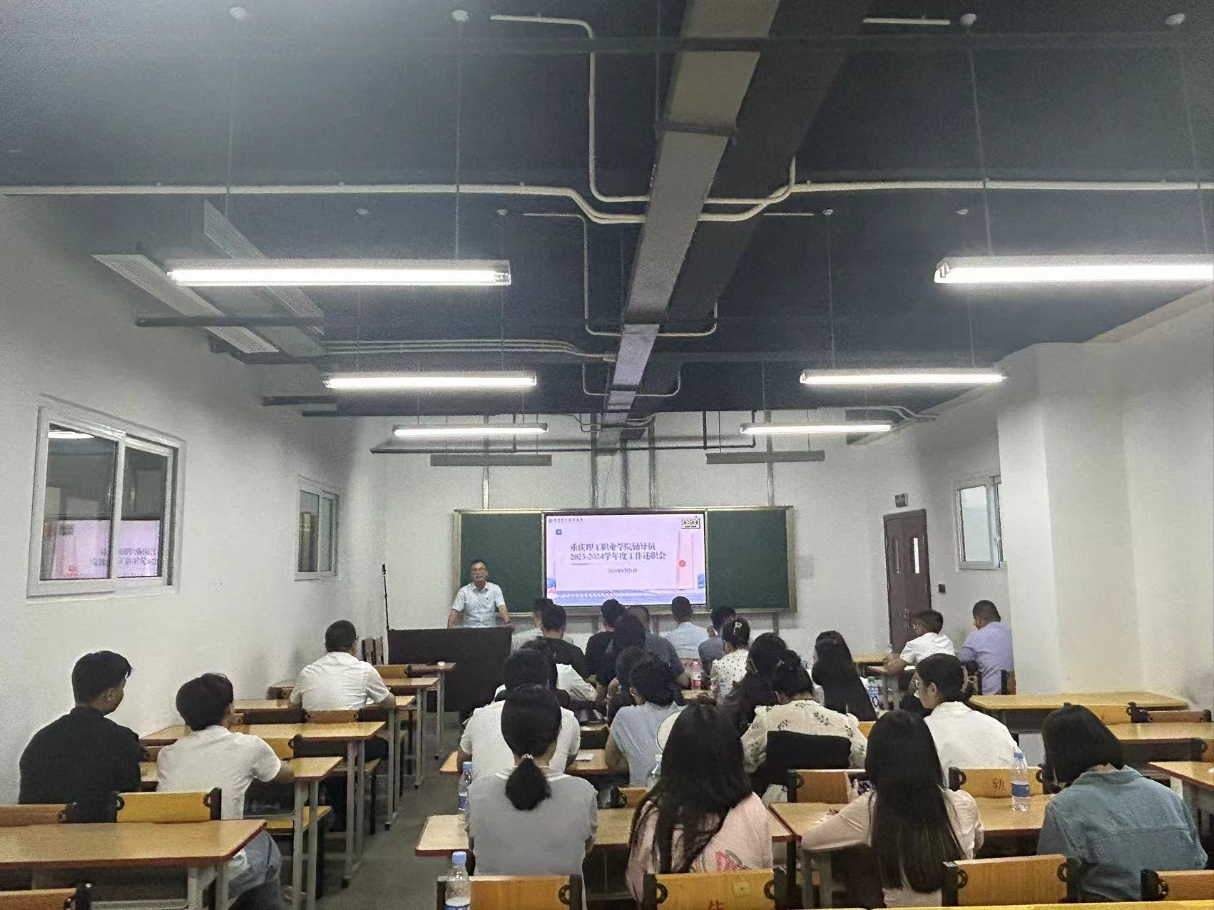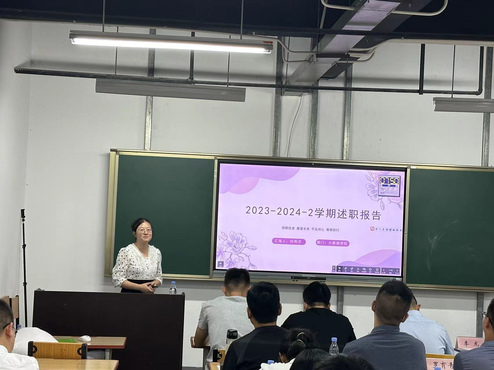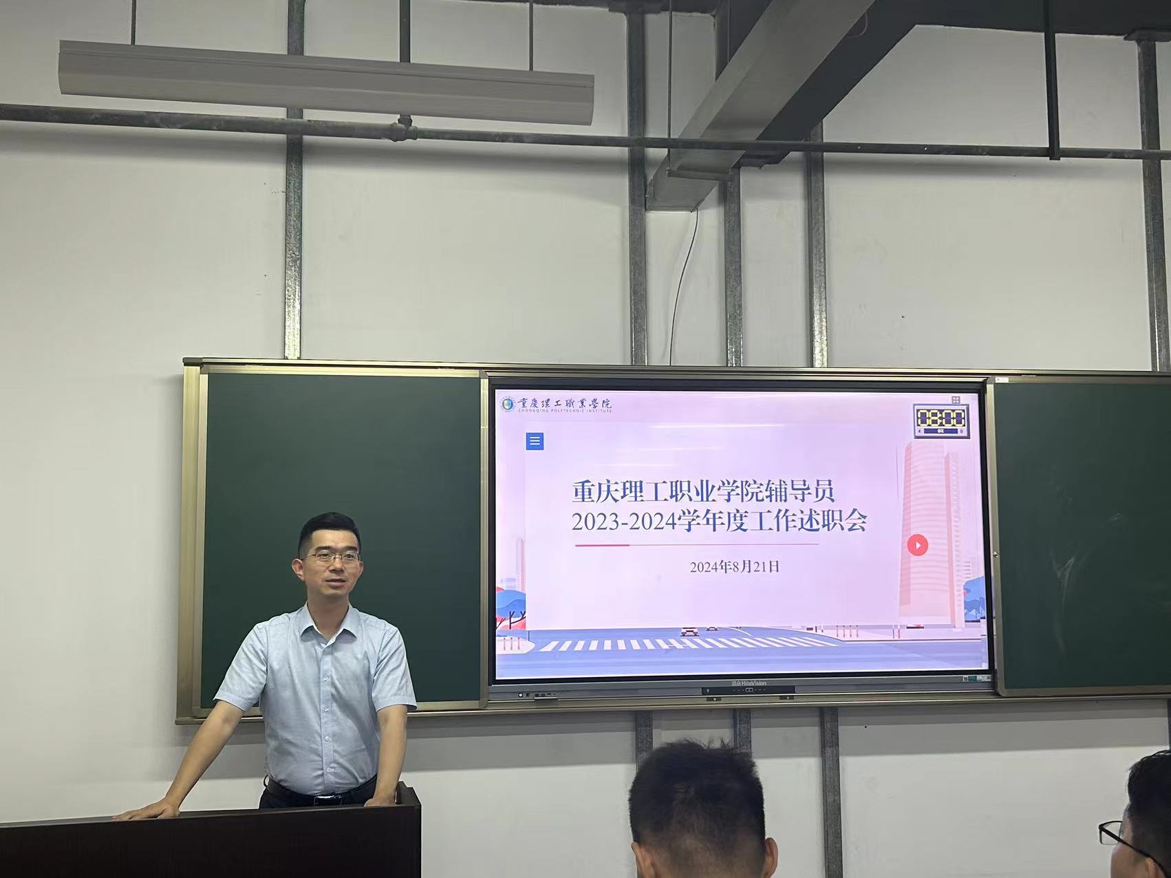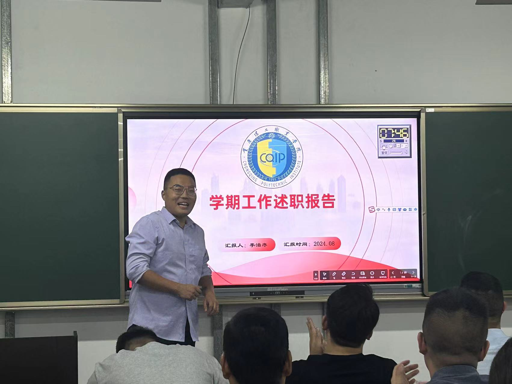 22名辅导员老师依次上台对2023-2024学年工作进行了总结述职,通过PPT汇报展示了过去一学年的工作情况,并对新学期工作提出了明确的工作目标与计划。