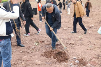 各个民族的师生在划分成“同心圆”的植树区域里,将一棵棵寓意56个民族血脉相连的石榴树苗植入土地。