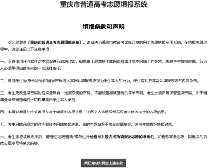 第二步,阅读重庆市教育考试院志愿填报网站网上填报志愿声明,然后点击“我已阅读并 熟知”。