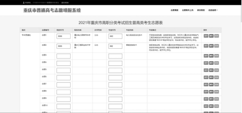 1.登录志愿填报系统。考生登录市教育考试院指定网站,进入网上填报志愿首页,选择响应时间最短的服务器入口地址登入。输入考生号(或身份证号)、高考报名时设置的密码以及随机出现的四位验证码,进入志愿填报系统。