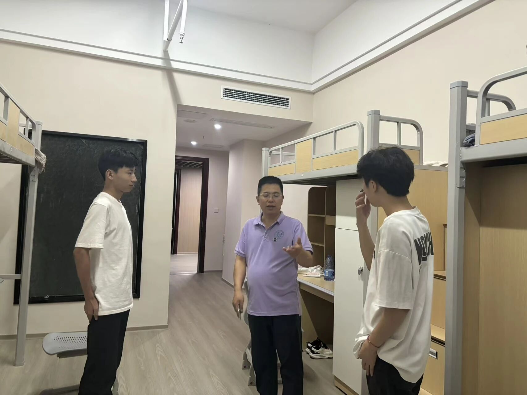 走访过程中,学院张婧月院长、罗御豪书记、马权副院长、学工主任唐超文一行,与新生亲切交谈,详细询问新生的住宿感受、生活需求及入学适应情况,耐心解答新生关于专业学习、校园生活服务等方面的疑问。