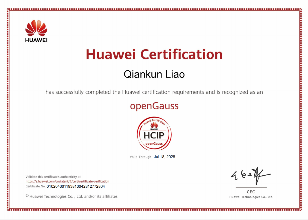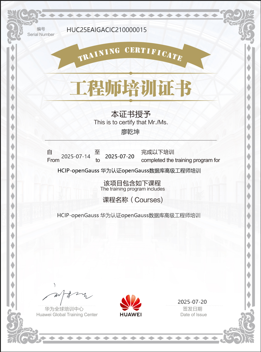 作为华为技术生态体系中的重要认证,HCIP(华为认证 ICT 高级工程师)代表着在相关技术领域的专业水准与实践能力。其中,AI方向聚焦网络基础设施构建与运维,openGauss 方向则深耕开源数据库技术应用,二者均是新工科建设中大数据、人工智能等领域的核心支撑技术。此次四位老师分别在两个方向斩获认证,不仅是个人专业能力的有力证明,更彰显了学院在 ICT 技术人才培养领域的前瞻性布局。