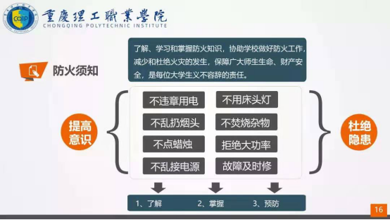 在一个多小时的安全教育培训中,党委副书记、副校长甘永诚紧紧围绕如何防盗、如何防骗、人身安全、交通安全、网络安全、防火须知等领域,围绕以上主题,以一个个生动鲜活的案例和近期学校学生中出现的安全问题开展教育。培训会上,要求同学们加强安全知识学习,学会保护自己,严格遵守交通安全。在学校图书馆、食堂教室等人员密集的地方提高警惕,提高安全意识,与陌生人交往中要注意自我防范;回家或外出时要结伴而行,避免单独行走;在宿舍不使用违章电器、不乱扔烟头等等。
