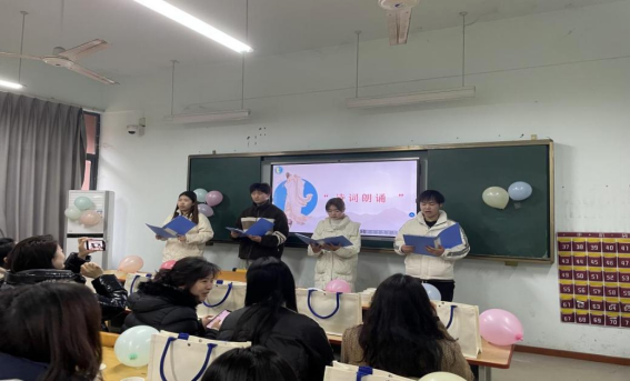 团总支学生会代表祝天琪、李汶骏、朱黎明、陈香伊四位同学带来的诗词朗诵,四位同学表达了对女老师们的辛苦付出与感谢。