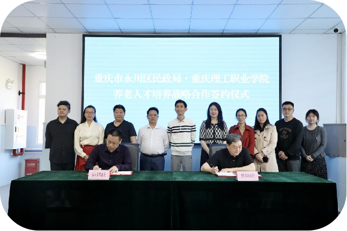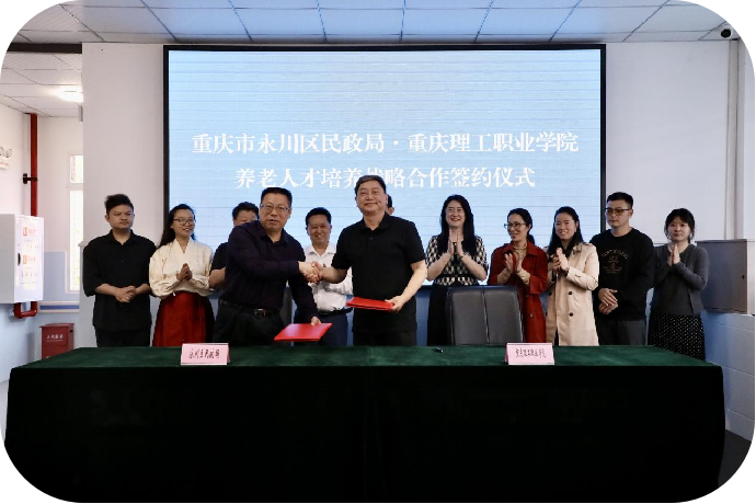 为充分发挥职业院校和行业部门叠加优势,创新和拓宽养老人才培养路径,4月26日,beat365英国官网网站校长黎明、卫生健康学院院长董萍萍、教务科研部部长助理匡萍及学院各专业负责人前往永川民政局、走访调研了永川区多家养老企业,并与永川民政局签订战略合作协议,永川区民政局党委书记、局长赵德君,副局长黄豫军,福利科科长李青蔓,养老服务协会会长李洪静,支部书记汪德才,秘书长童斌,集中供养中心主任陈永波等参加签约仪式。
