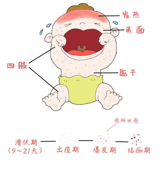 症状:水痘是一种由水痘带状疱疹病毒所引起的急性传染病;水痘的潜伏期一般为14-16天,患者可出现头痛、全身不适、发热、食欲下降等前期症状,继而出现有特征性的红色斑疹,后变为丘疹、再发展为水疱、常伴有瘙痒,1-2天后开始干枯结痂,持续一周左右痂皮脱落。皮疹躯干部最多,头面部次之,四肢较少,手掌、足底更少。