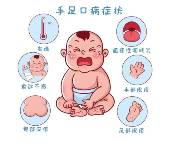 症状:手足口病是由肠道病毒引起的急性发热出疹性传染病;表现为发烧、手心、脚心出现斑丘疹和疱疹(疹子周围可发红)、口腔粘膜出现疱疹或溃疡,疼痛明显。部分患者可伴有咳嗽、流涕、食欲不振、恶心、呕吐和头疼等症状。