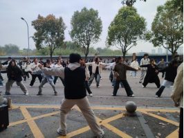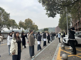 与此同时,学校1教-3教停车场区域成为24级同学的八段锦练习场。作为中华传统养生健身功法,八段锦动作优美,内涵丰富。在领操员的带领下,同学们全神贯注,认真学习每一个动作。从起势的宁静沉稳,到“双手托天理三焦”时的舒展向上,再到“摇头摆尾去心火”的灵动活泼,一招一式尽显刚柔并济。他们在一呼一吸间感受传统文化的独特魅力,在动静结合中强身健体、涵养身心。