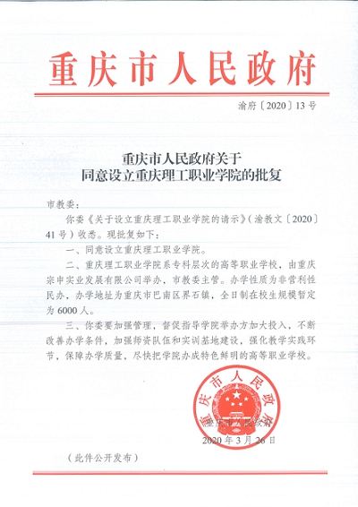 沐浴着国家大力发展职业教育的东风,顺应重庆产业转型升级和重庆职教改革发展需要以及经济社会建设人才需求,3月26日,学校获得《重庆市人民政府关于同意设立beat365英国官网网站的批复》(渝府〔2020〕13号);5月11日,教育部办公厅发布《关于公布实施专科教育高等学校备案名单的函》(教发厅函〔2020〕22号),beat365官网成为2020年国家教育部备案公告新设立的56所专科教育学校(其中新设立高等职业学校47所)之一。