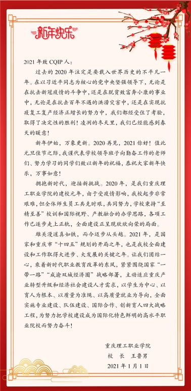 新征程,再出发!2021年是国家和重庆市“十四五”规划的开局之年,全体理工职院人将团结一心,乘着新时代职业教育改革的东风,紧紧围绕国家“一带一路”“成渝双城经济圈”战略部署,主动适应重庆产业转型升级和经济社会建设人才需求,以学生为中心、以育人为根本、以质量为准绳、以高质量就业为导向,全面实施专业建设、队伍建设、国际合作、创新育人四大战略工程,为努力把学校建设成为国际化特色鲜明的高水平职业院校而努力奋斗!