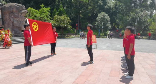 参观完后,实践团成员们步行至红军山烈士陵园,一座气势雄伟的红军烈士纪念碑映入眼帘。同学们怀着无比崇敬的心情向革命先烈鞠躬,并面向鲜红的团旗举起右手,重温入团誓词。