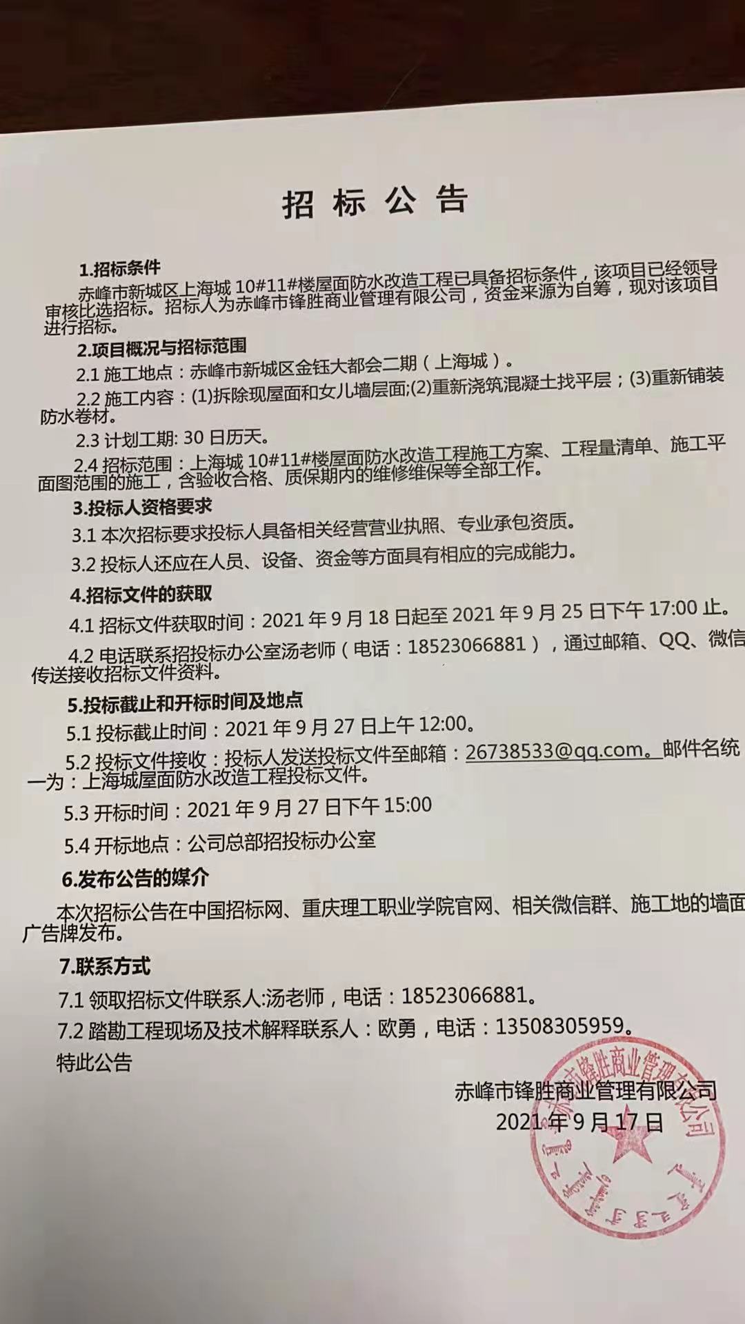 赤峰市上海城10#11#楼屋面防水改造工程招标