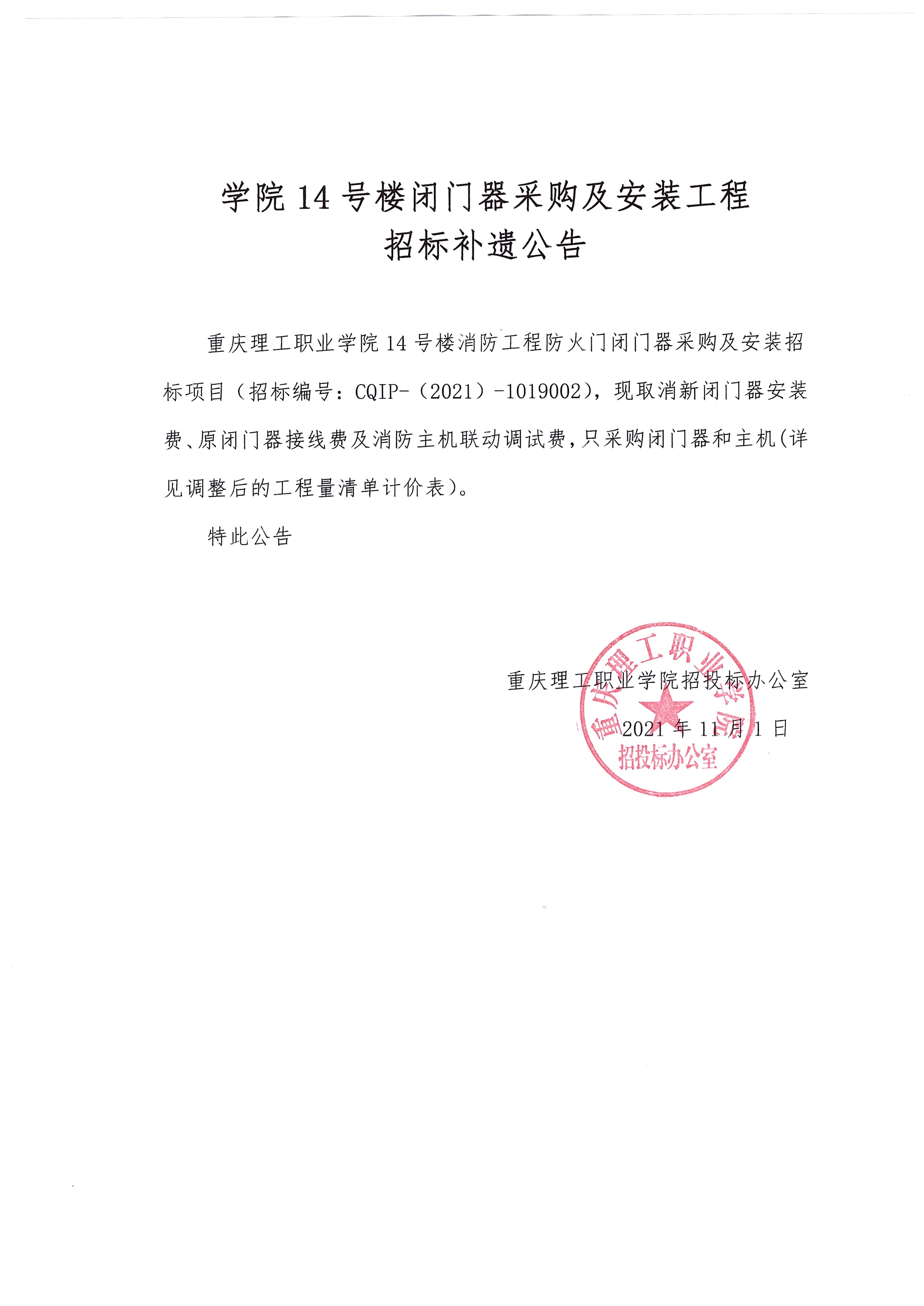 学院14号楼闭门器采购招标补遗公告